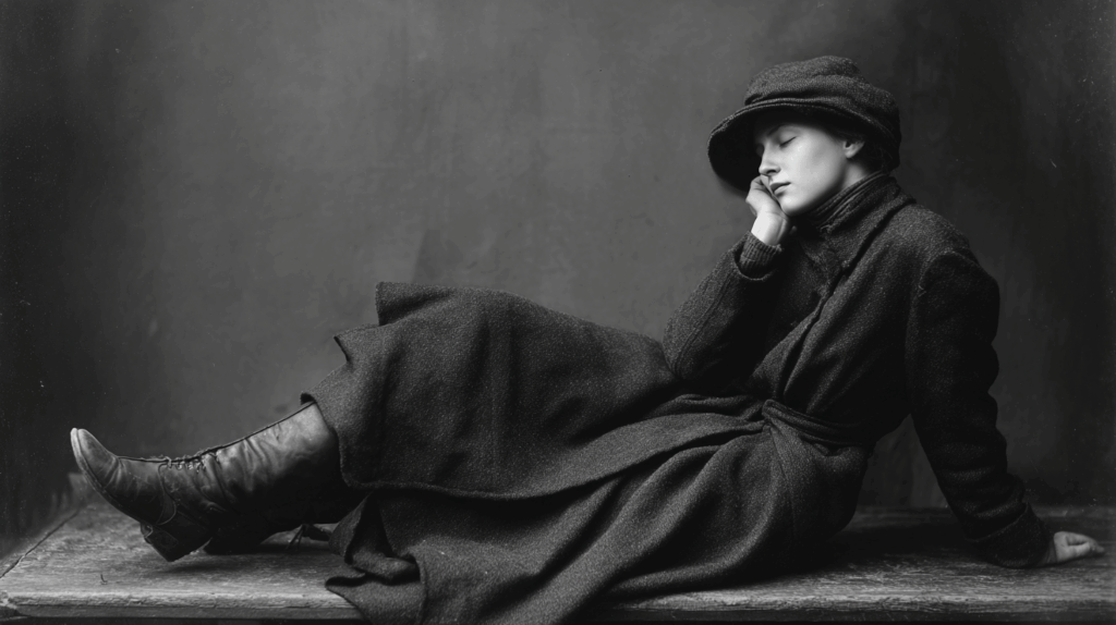 Le galbe d’un mollet perdu dans le cuir d’une botte. Le corps engoncé dans un manteau trop droit. La toile de laine masque la légèreté que l’on connaît pourtant, pour avoir vécu le printemps. L’ersatz d’un sourire nostalgique : la scène fait écho à une autre, encore douloureuse, qu’on serait seul à repérer. Tout semble retenu, contraint, subi, enfoncé dans le gris. Ce qu’on voit : un automne frileux aux promesses de déserts froids. Les yeux même, presque fermés, deux fentes sans expression. Mais savoir que la saison passera comme d’autres ont passé dans l’éclosion de leur éclat d’argent.