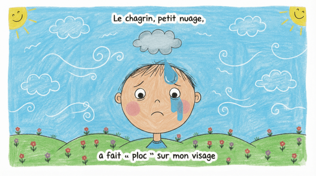 Alors on reste là, étonné de n’être pas submergé, regrettant l’époque où l’on ne se maîtrisait pas. Restent des mots pour une comptine de cour d’école : le chagrin, petit nuage, a fait « ploc » sur mon visage… Conjurer le sort un vers après l’autre, de plus en plus doux, comme des souvenirs qui s’estompent : donne lui un mouchoir blanc, il sourit timidement…